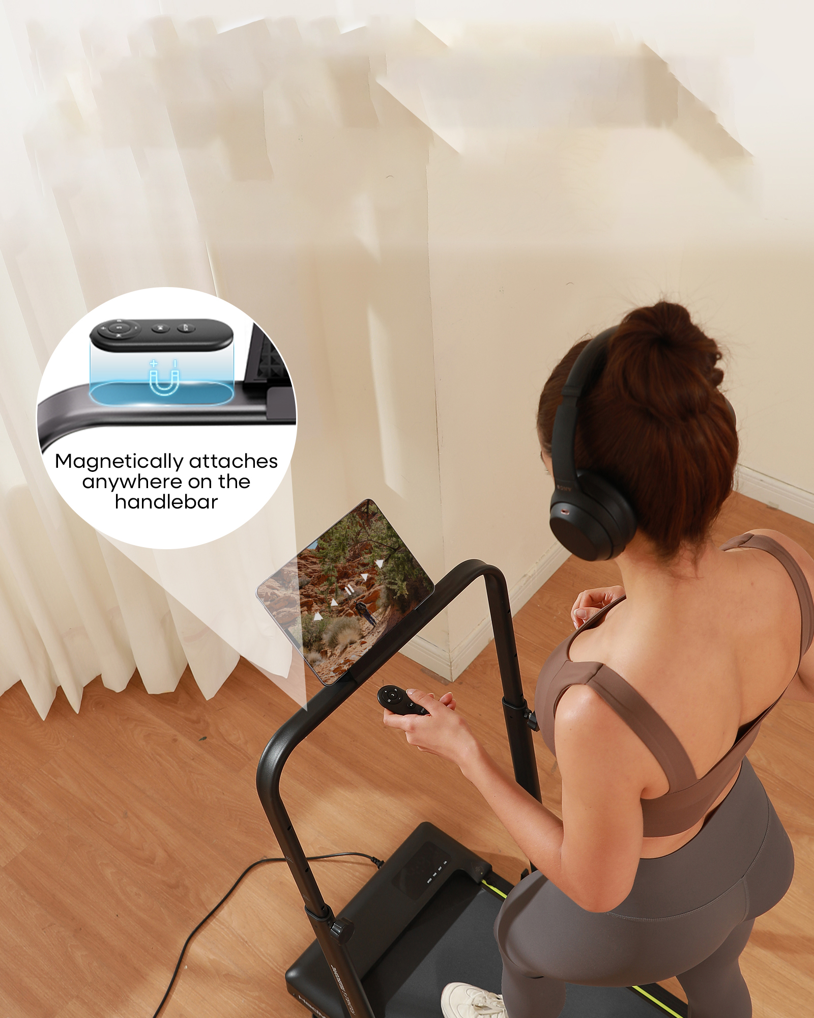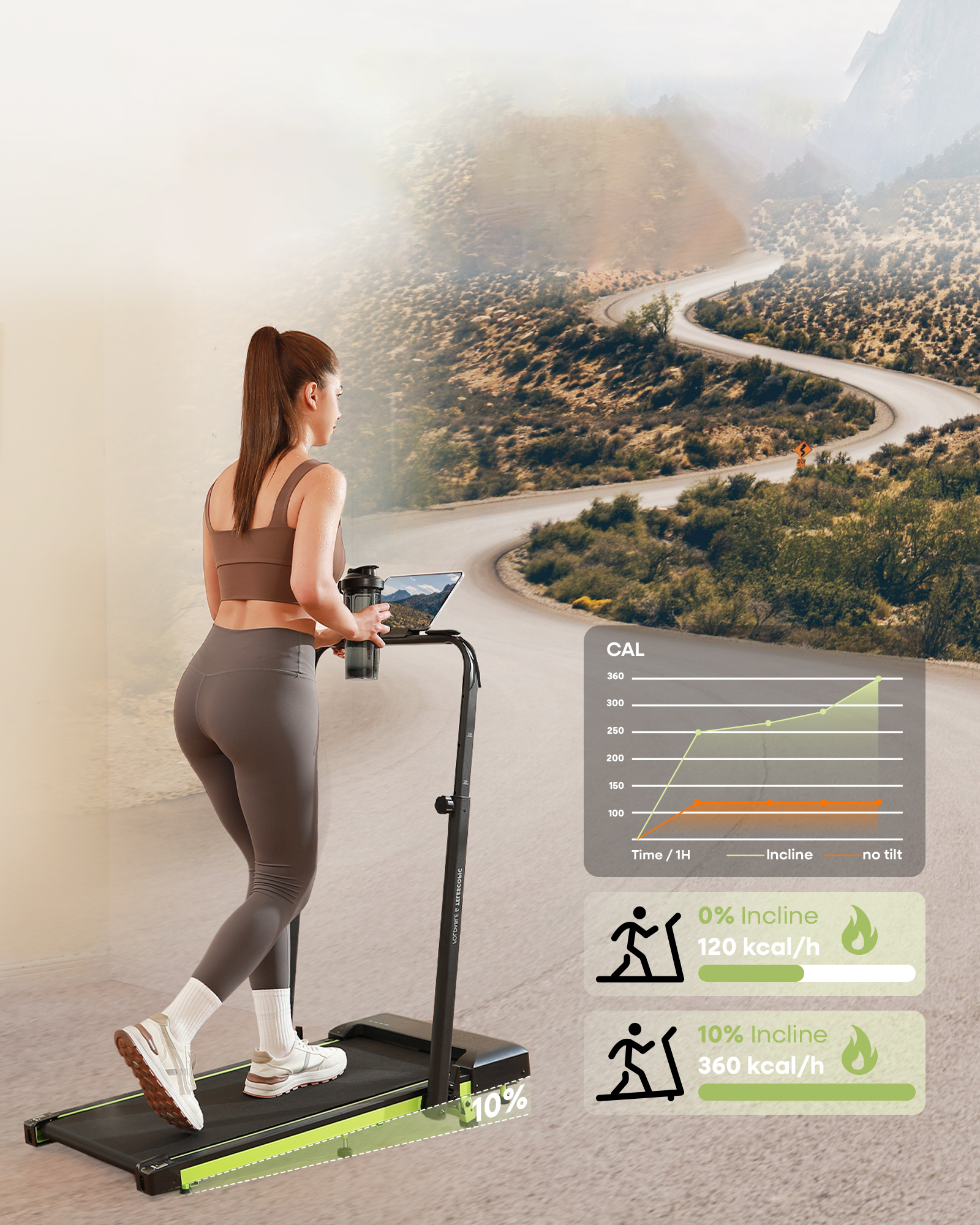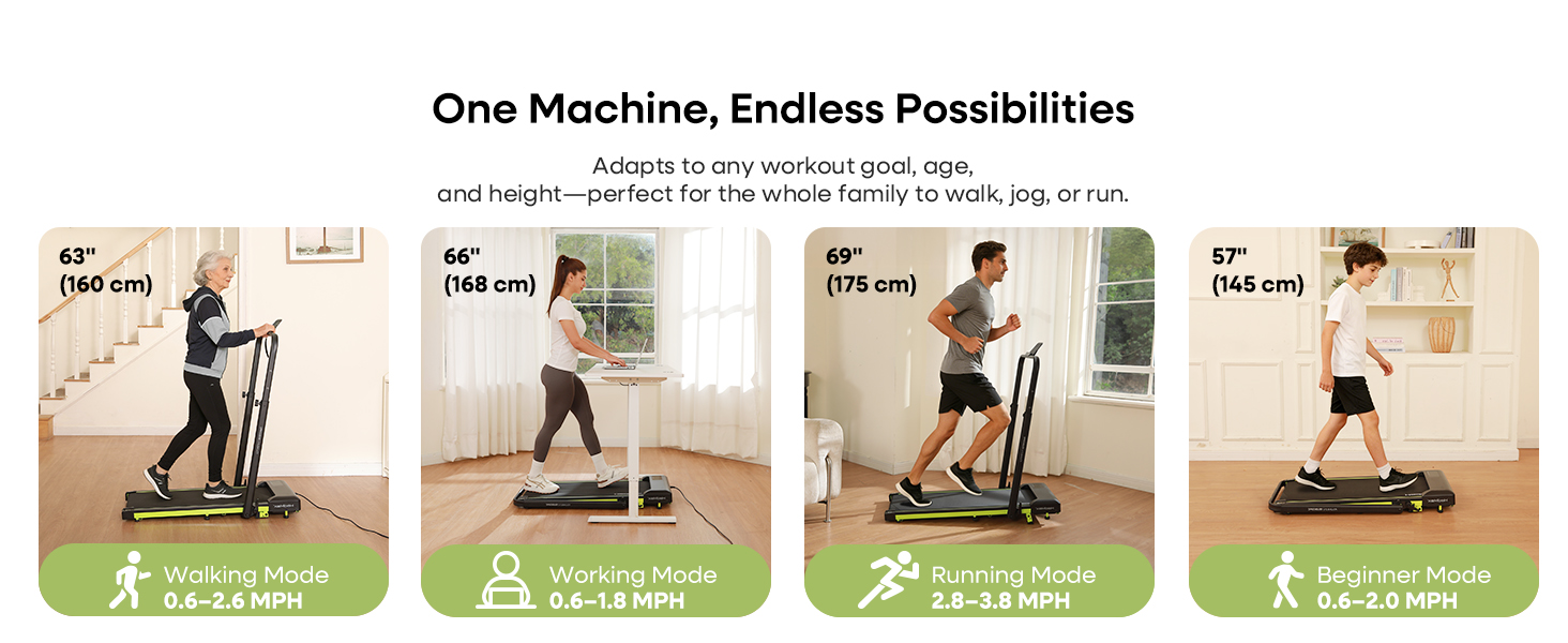 The treadmill offers speeds from 0.6 to 3.8 MPH (1–6 km/h), suitable for under-desk walking, casual workouts, and light jogging.