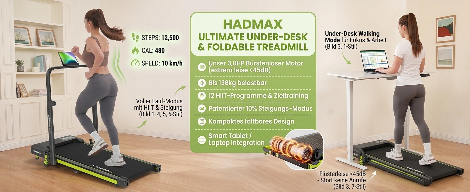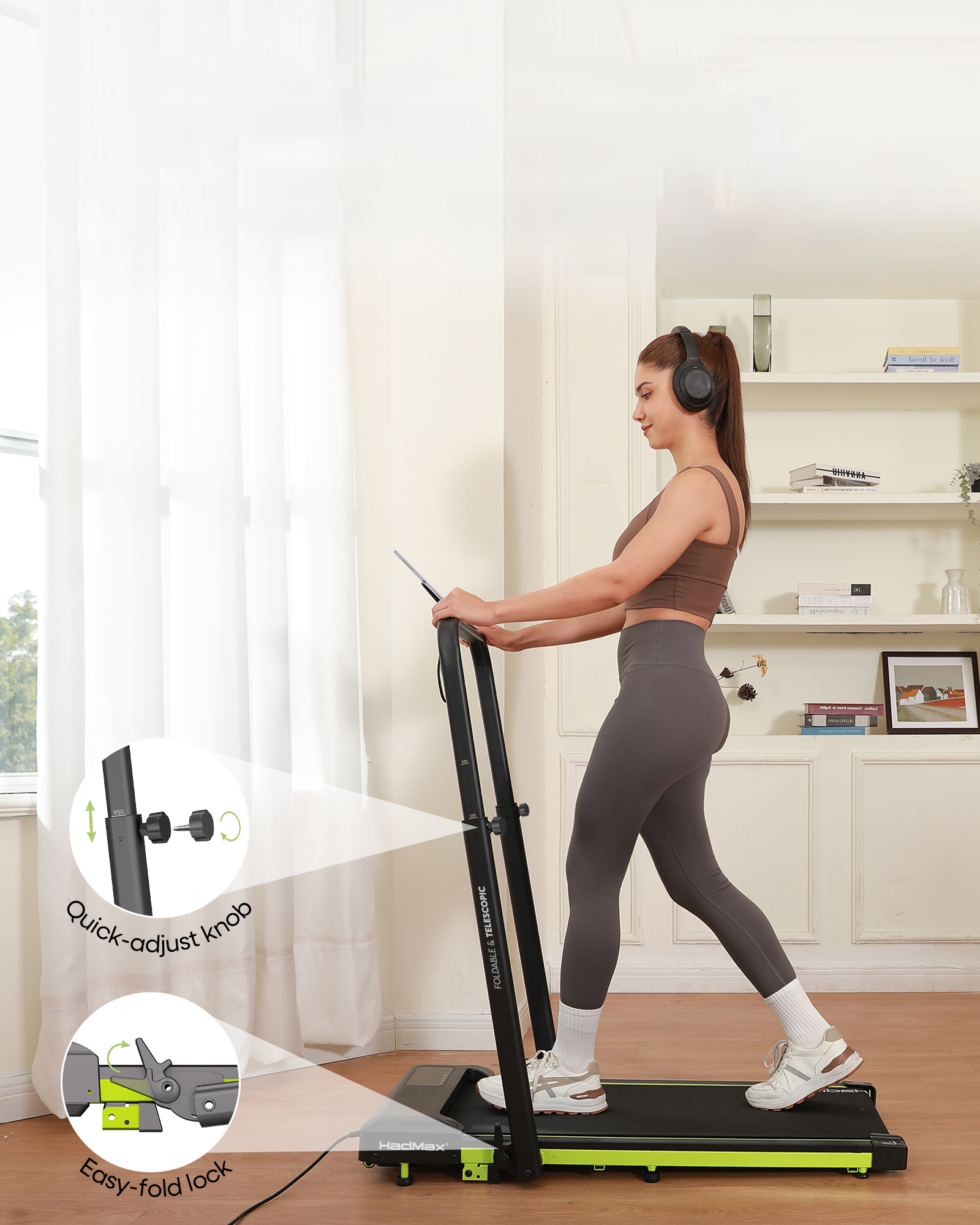 The HADMAX walking pad supports users up to 300 lbs, providing stable and reliable performance for daily walking and light jogging.